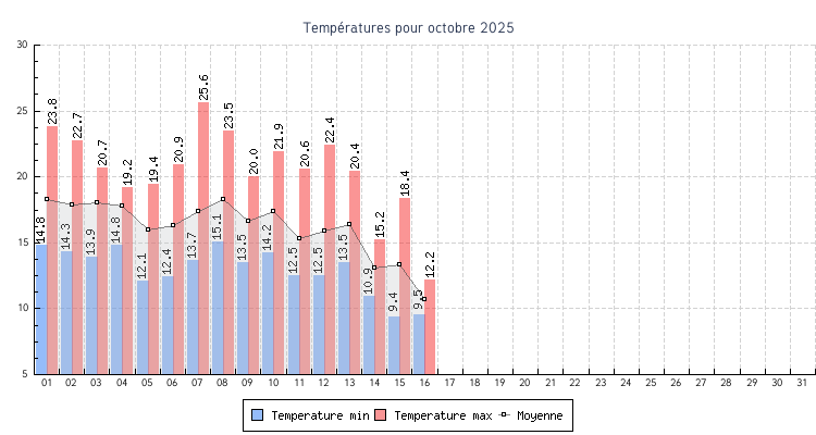 | 09 | 13.5 °C à 08:18 | 20.0 °C à 14:23 | 16.6 °C | 13.8 km/h (35.6 km/h) | 30 |