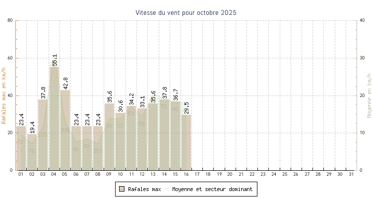 | 04 | 14.8 °C à 22:48 | 19.2 °C à 08:52 | 17.8 °C | 30.3 km/h (55.1 km/h) | 271 |